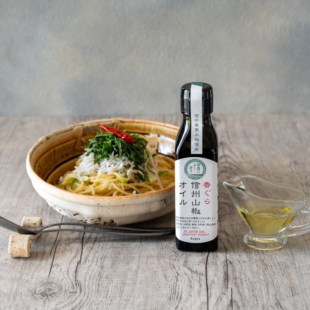 信州産の上質な山椒(さんしょう)の実を「神楽」独自の製法で米油に漬け込み、山椒の風味をオイルに閉じ込めた香り高い和のフレーバーオイル(山椒オイル)です。